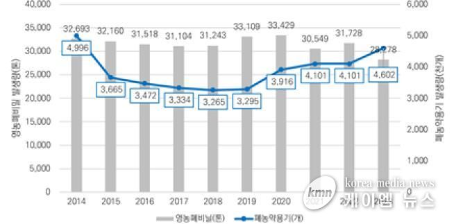 2023년 기준 경기도 영농폐기물 발생량은 영농 폐비닐이 약 3만 톤(93%), 폐농약 용기가 약 460만 개(94%)로 나타났다.