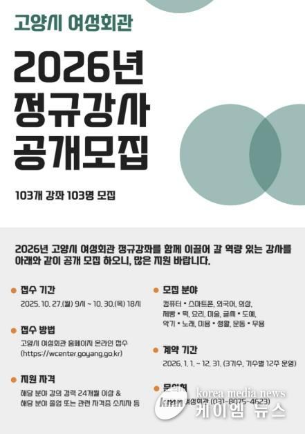 (케이엠뉴스) 고양특례시 여성회관에서 2026년 정규강좌 운영을 위한 정규강사진을 공개 모집한다.