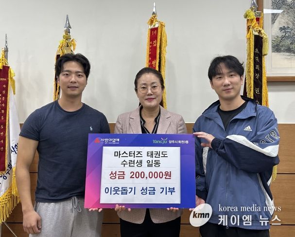 (케이엠뉴스) 양주시 회천3동(동장 조전희)이 16일 마스터즈태권도(공동대표 구자환·배재용)에서 행정복지센터를 방문해 어린 수련생들의 정성이 담긴 성금을 전달하고 기부식을 진행했다고 밝혔다.