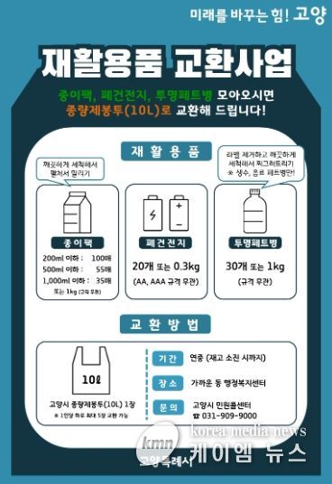 (케이엠뉴스) 고양특례시가 2회 추가경정예산을 통해 2천만 원을 확보해 시민들의 호응 속에 추진 중인 재활용품 교환사업을 계속 이어간다.