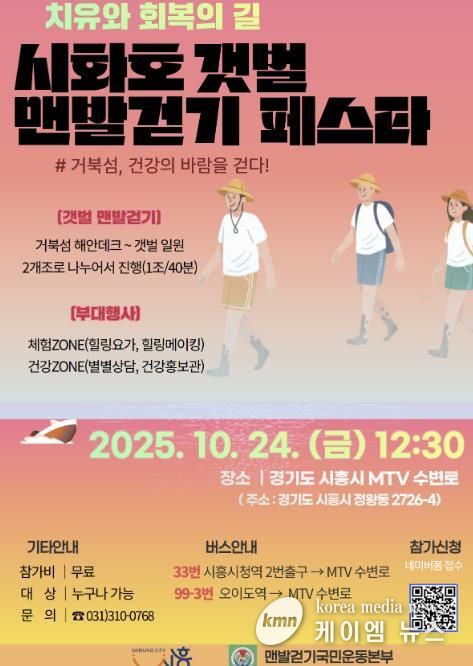 (케이엠뉴스) 시흥시는 오는 10월 24일 오후 12시 30분, 거북섬 해안 덱(MTV 수변로)에서 ‘2025 시화호 갯벌 맨발걷기 페스타’를 개최한다.