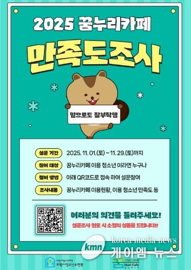 (케이엠뉴스) 의왕시청소년재단 산하 꿈누리카페(는 청소년의 이용 만족도와 공간 운영 개선을 위한 ‘청소년 만족도 및 욕구조사’11월 1일부터 11월 29일까지 약 한 달간 실시 한다.