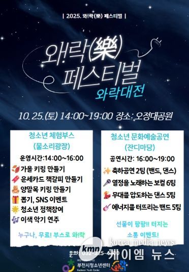 (케이엠뉴스) 부천여성청소년재단이 운영하는 부천시청소년센터는 오는 10월 25일 오후 2시, 부천 오정대공원에서 와!락(樂) 페스티벌 ‘와락대전’을 진행한다고 밝혔다.