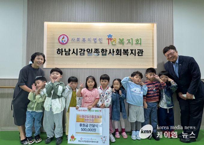 (케이엠뉴스) 시립감일리틀포레어린이집은 지난 10월 14일 하남시감일종합사회복지관(사회복지법인 휴먼복지회 운영)에 후원금을 전달했다.