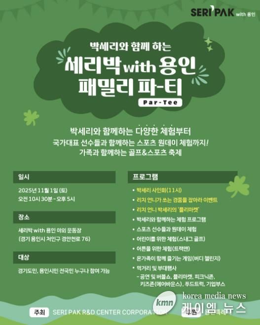 (케이엠뉴스) 용인특례시는 11월 1일 오전 10시 30분부터 오후 5시까지 처인구 경안천로 76에 위치한 ‘SERI PAK with 용인’ 야외운동장에서 골프 레전드 박세리 전 감독과 함께하는 ‘SERI PAK with 용인 패밀리 파티(Par-Tee)’를 개최한다고 21일 밝혔다.