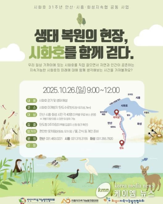 (케이엠뉴스) 시흥ㆍ안산ㆍ화성 지속가능발전협의회는 시화호를 함께 품고 있는 세 개 도시의 공동 사업으로, 시화호 담수화 중단 31주년을 맞아 오는 10월 26일 오전 9시부터 ‘생태복원의 현장, 시화호를 함께 걷다’ 행사를 탄도수로(탄도항~외지섬)에서 개최한다.