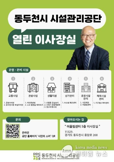 (케이엠뉴스) 동두천시 시설관리공단은 시민과의 소통을 강화하고 현장의 목소리를 경영에 적극 반영하기 위해 10월부터 ‘열린 이사장실’을 연중 상시 운영한다고 밝혔다.