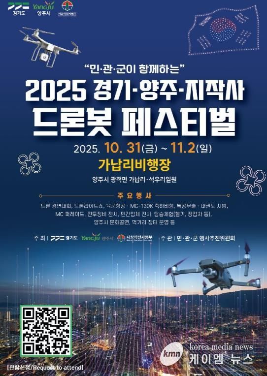 (케이엠뉴스) 경기도와 양주시, 지상작전사령부가 오는 31일부터 11월 2일까지 3일간 가납리비행장 일원에서 '2025 경기ㆍ양주ㆍ지작사 드론봇 페스티벌'을 개최한다.