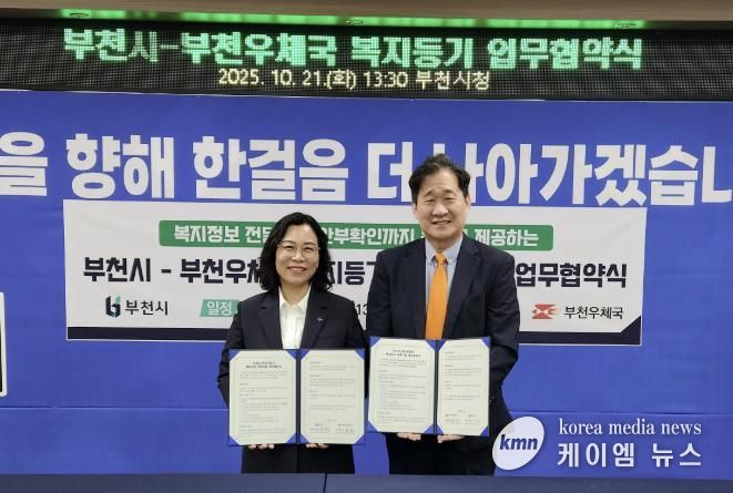 (케이엠뉴스) 부천시는 지난 21일 부천우체국과 ‘복지등기 서비스 지원’을 위한 업무협약을 맺고, 우편배송망을 활용해 복지사각지대를 발굴하고 위기가구를 지원하는 공공협력 체계를 본격적으로 가동한다.