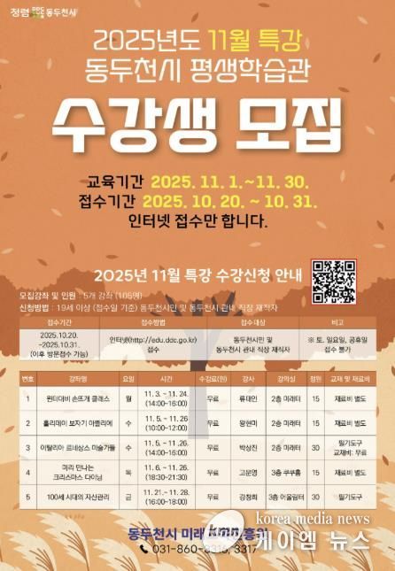 이번 특강은 계절감과 시민 수요를 반영한 다양한 주제로 구성됐으며, 남녀노소 누구나 참여할 수 있는 생활 밀착형 프로그램으로 운영된다. 수강 신청은 10월 31일까지 동두천시 미래교육진흥원 홈페이지에서 온라인으로 접수할 수 있다.