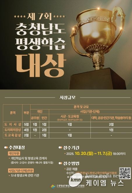 (케이엠뉴스) 충남평생교육인재육성진흥원은‘2025년 제7회 충남 평생학습대상’표창 공모를 실시한다고 23일 밝혔다.