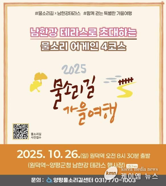 (케이엠뉴스) 양평군은 오는 10월 26일 ‘물소리길 어게인 4코스’에서 물소리길 걷기 행사를 개최한다고 밝혔다. 이번 행사는 출발지인 원덕역을 시작으로 양평군청 앞 남한강테라스 행사장까지 이어진다.