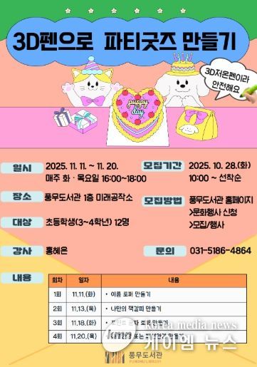 (케이엠뉴스) 김포시 풍무도서관에서는 초등학생 3~4학년을 대상으로 ‘3차원 펜으로 파티굿즈 만들기’를 오는 11월 11일부터 11월 20일까지 매주 화·목요일 오후 4시부터 6시까지 총 4회에 걸쳐 운영한다.