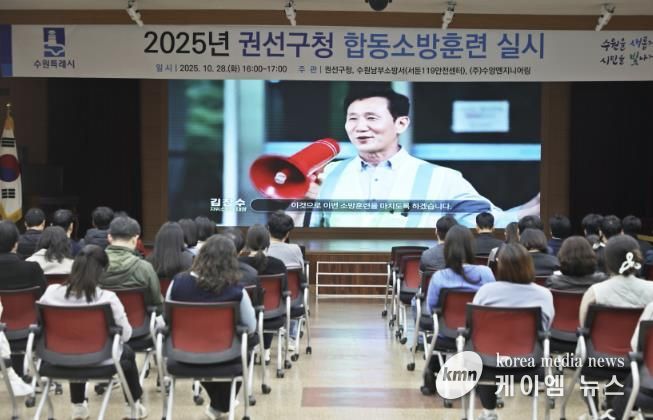 (케이엠뉴스) 수원시 권선구는 지난 28일 수원남부소방서(서둔119안전센터)와 권선구 직원들과 함께 공공기관 합동소방훈련을 실시했다.