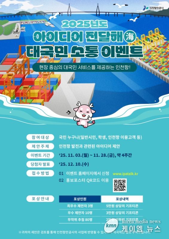 (케이엠뉴스) 인천항만공사는 대국민·이해관계자와의 소통을 활성화하고 국민 제안을 인천항 운영에 반영하기 위해 ’2025년 아이디어 전달해(海)‘를 이달 28일까지 약 4주간 운영한다고 2일 밝혔다.
