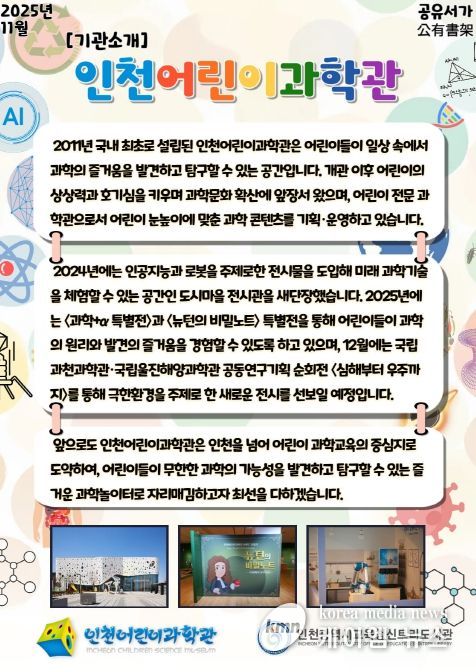 (케이엠뉴스) 인천광역시교육청신트리도서관은 11월 4일부터 30일까지 인천시설공단 산하 인천어린이과학관과 함께 ‘11월 공유서가’를 운영한다.