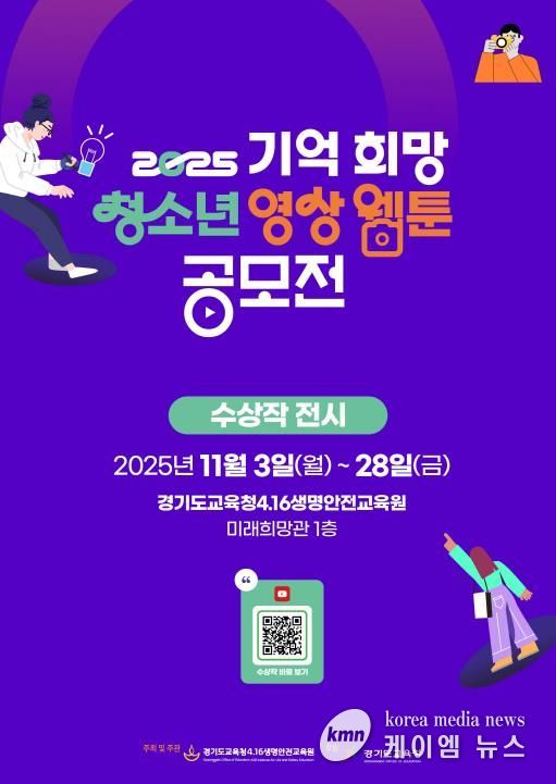 3일부터 28일까지 경기도교육청4.16생명안전교육원 미래희망관 1층 전시공간에서 진행되는 이번 전시에서는 영상 부문 10점, 웹툰 부문 10점 등 총 20점의 작품을 선보인다.