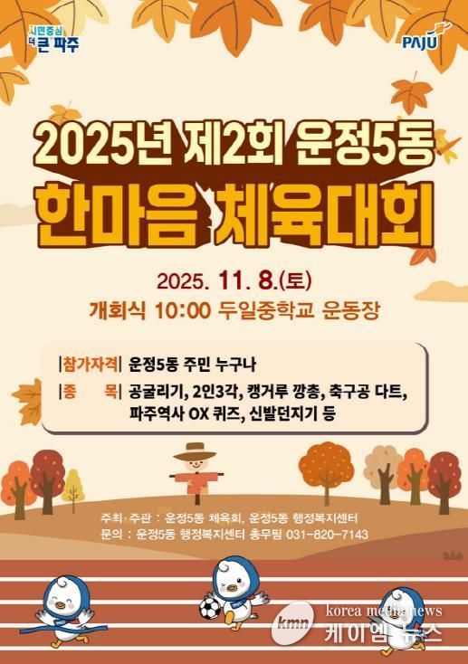 (케이엠뉴스) 파주시 운정5동은 오는 11월 8일 토요일 두일중학교에서 녩년 제2회 한마음 체육대회’를 개최한다.