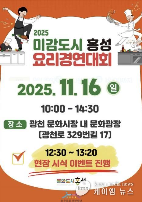 (케이엠뉴스) 홍성군은 오는 16일 광천 문화시장 내 문화광장에서 ‘2025년 미감도시 홍성 요리경연대회’를 개최한다고 밝혔다.