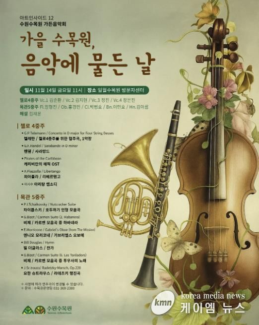 (케이엠뉴스) 수원특례시가 14일 오전 11시 일월수목원 방문자센터 물빛누리홀에서 ‘가을 수목원, 음악에 물든 날’ 가든 음악회를 연다.