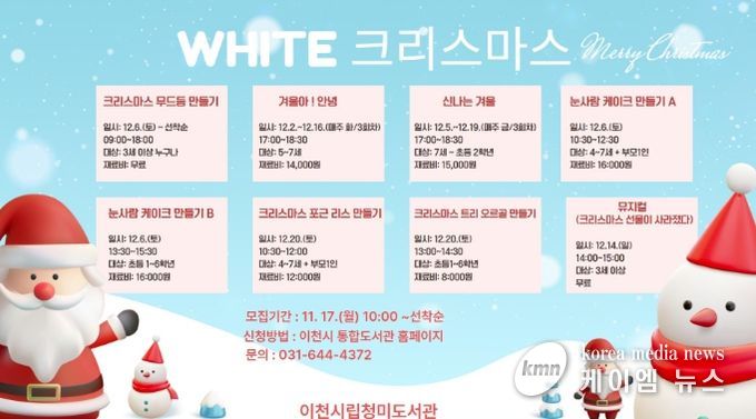 (케이엠뉴스) 이천시 청미도서관이 다가오는 크리스마스를 맞아 가족이 함께 즐길 수 있는 다채로운 겨울 프로그램을 운영한다. 이번 프로그램은 유아부터 가족 단위 이용자까지 모두가 참여할 수 있도록 구성되어, 따뜻하고 포근한 겨울 감성 속에서 즐겁고 뜻깊은 경험을 선사할 예정이다.