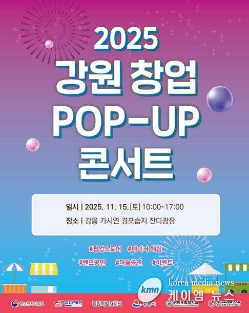(케이엠뉴스) 강원도립대학교는 오는 11월 15일, 강릉 경포 가시연 습지 잔디광장에서 도내 창업자와 지역주민이 함께 참여하는 '2025 강원 창업 팝-업(POP-UP) 콘서트'를 개최한다.