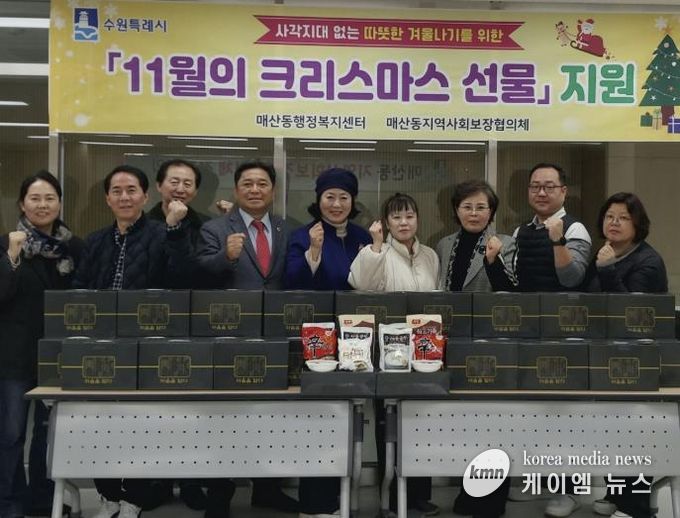 (케이엠뉴스) 수원시 팔달구 매산동 지역사회보장협의체는 지난 12일, ‘11월의 크리스마스 선물 전달식’을 열고 관내 어려운 이웃들에게 음식 꾸러미 150세트를 전달했다.