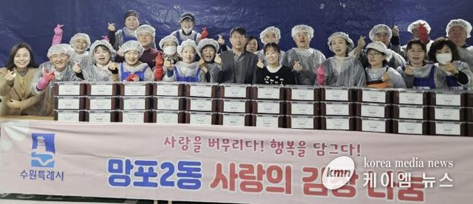 (케이엠뉴스) 수원시 영통구 망포2동은 지난 13일 망포2동 행정복지센터에서 2025 이웃사랑 김장 나눔 행사를 진행했다. 망포2동 새마을문고가 주관하고 망포2동 단체협의회가 후원하여 진행한 김장 나눔 행사에서 10여 명의 인원이 모여 김장 김치를 담갔다.