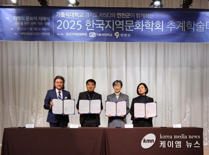 (케이엠뉴스) 경기문화재단 전곡선사박물관은 지난 7일 백학자유로리조트 컨벤션센터에서 연천군, 가톨릭대학교, 한국지역문화학회와 경기도 RISE 사업과 연계한 ’경기북부 지역혁신 네트워크 구축‘ 업무협약(MOU)을 체결했다.