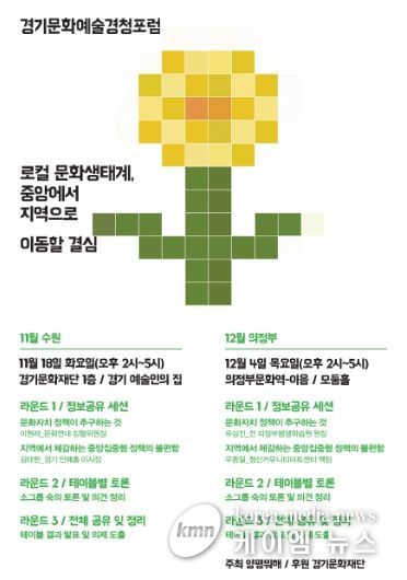 경청포럼은 국민주권정부의 문화정책 변화와 함께 경기도가 준비 중인 기초지자체 기반의 상향식 지역문화 정책의 기본 방향을 가늠해 보기 위해 경기 남부(수원)와 북부(의정부)에서 각각 11월 18일 오후 2시(수원 경기문화재단 경기예술인의 집)와 12월 4일 오후 2시(의정부문화역-이음)에 열린다.