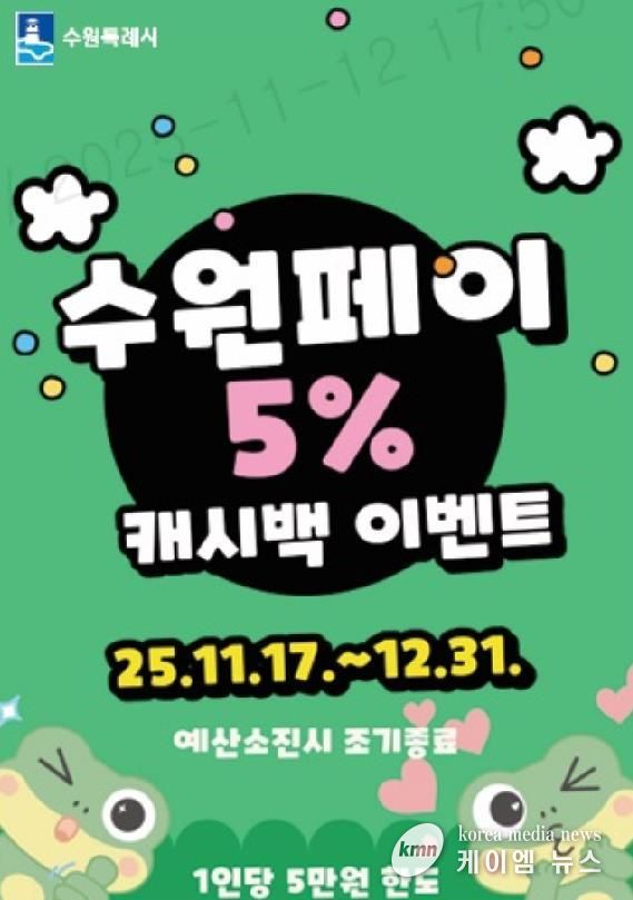 수원특례시는 17일부터 12월 31일까지 ‘수원페이 5% 캐시백 이벤트’를 연다. 수원페이 충전금으로 결제하면 5% 캐시백을 지급한다.