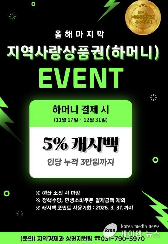 (케이엠뉴스) 하남시는 연말 소비 활성화를 위해 오는 11월 17일부터 12월 31일까지 지역사랑상품권 ‘하머니’ 결제 금액의 5%를 캐시백 형태로 환급하는 이벤트를 진행한다.