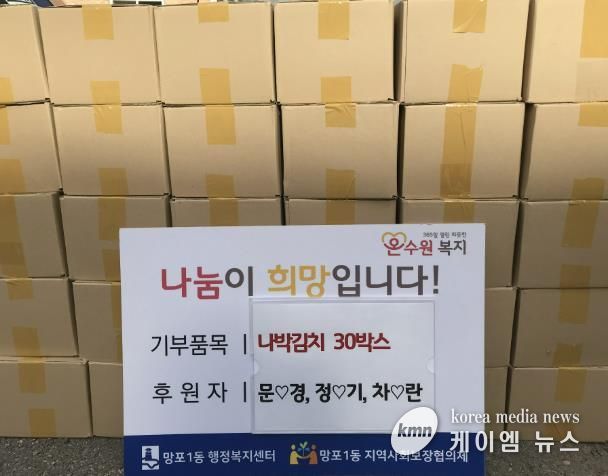 (케이엠뉴스) 수원시 영통구 망포1동행정복지센터는 지난 17일, 망포1동 주민 3명이 저소득 취약계층을 위해 나박김치 30박스를 후원했다고 밝혔다.