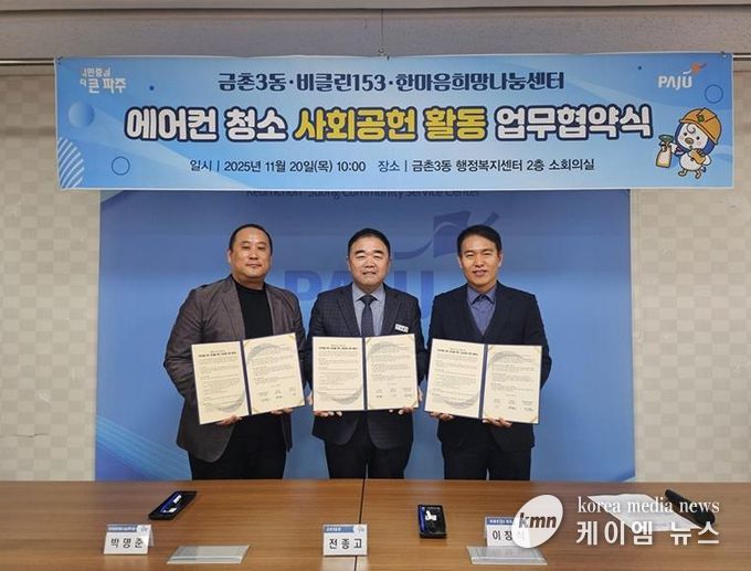협약에 따라 금촌3동은 대상자 발굴 및 행정적 지원을 담당하며, ‘비클린153’은 전문 장비와 기술을 활용해 생활가전 청소 서비스를 무상으로 제공한다. 또한 ‘한마음희망나눔센터’는 가정용 청소용품 꾸러미를 무상으로 지원할 예정이다.