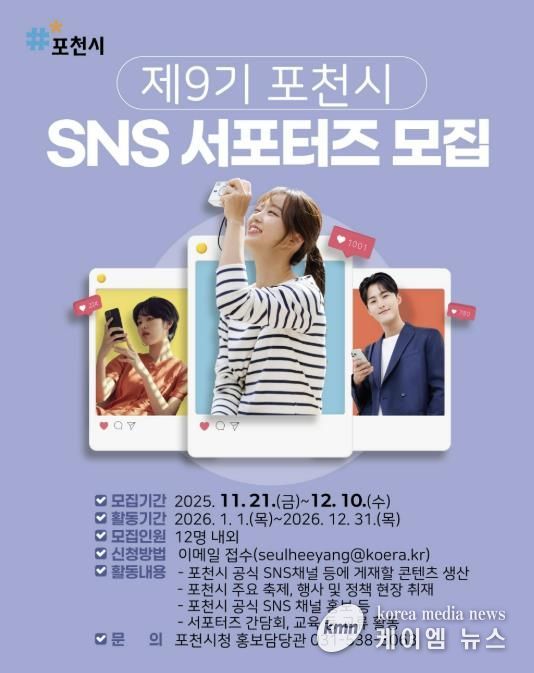 (케이엠뉴스) 포천시는 시민의 시선으로 시정과 지역 소식을 생생하게 전달할 ‘2026년 제9기 포천시 누리소통망(SNS) 서포터즈’를 오는 12월 10일까지 공개 모집한다.