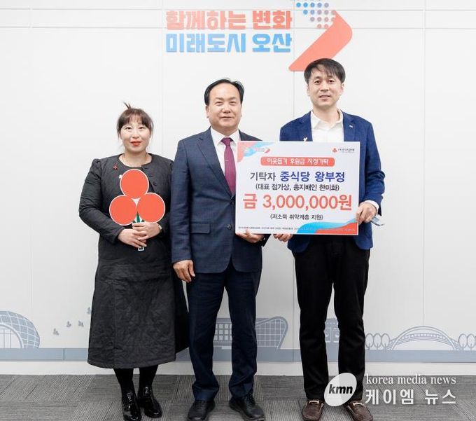 (케이엠뉴스) 오산시는 지난 20일 왕부정 유한회사(대표 점가상)로부터 관내 저소득 취약계층을 위한 성금 300만 원을 기탁받았다고 밝혔다.