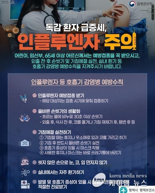(케이엠뉴스) 평택시는 이번 觝-觞절기 인플루엔자 유행이 예년보다 이르게 시작됨에 따라, 감염병 확산 방지를 위해 예방접종 참여 및 마스크 착용 등 기본적인 예방수칙 준수를 시민들에게 당부했다.
