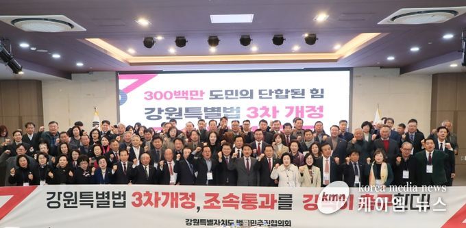 (케이엠뉴스) 강원특별자치도 범국민추진협의회(협의회장 최양희, 추진단장 김천수)가 11월 21일 11시, 춘천 스카이컨벤션 2층 컨벤션홀에서 강원특별법 3차개정 조속 통과 촉구 결의대회를 개최했다.