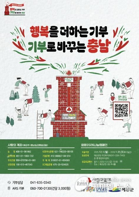 (케이엠뉴스) 예산군은 오는 12월 1일부터 내년 1월 31일까지 어려운 이웃에게 희망을 전하는 ‘희망2026 나눔캠페인’에 돌입한다고 밝혔다.