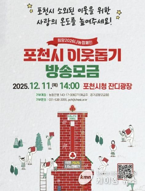 (케이엠뉴스) 포천시는 복지사각지대를 해소하고 안정적인 복지재원 마련을 위해 ‘행복을 더하는 기부, 기부로 바꾸는 포천’을 주제로 '희망2026 나눔 캠페인 포천시 이웃돕기 방송모금' 행사를 개최한다.