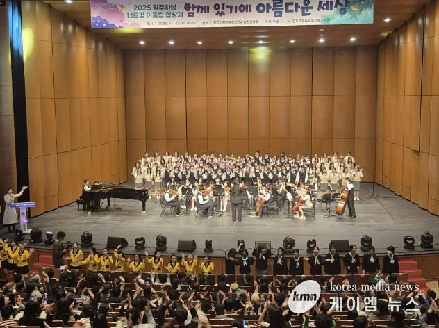 (케이엠뉴스) 경기도광주하남교육지원청은 11월 22일 광주시문화예술의전당 남한산성홀에서 ‘2025 너른강 어울림 합창제’를 개최했다. 이번 행사는 ‘함께 있기에 아름다운 세상’을 주제로 열렸으며, 초·중·특수학교 학생과 교사, 오케스트라 단원 등 약 360명이 무대에 올라 지역 예술교육 축제의 의미를 더했다. 관람객은 약 500여 명에 달했다.