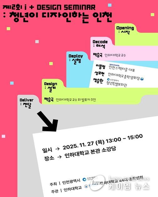 (케이엠뉴스) 인천광역시는 오는 11월 27일 오후 1시 인하대학교 소강당에서 ‘제2회 아이플러스(i+) 디자인 세미나 : 청년이 디자인하는 인천’을 개최한다고 밝혔다.