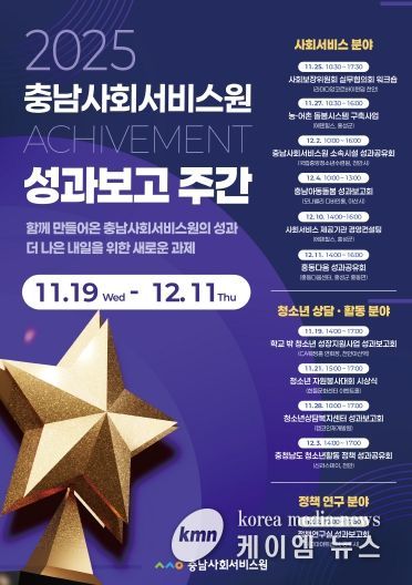 (케이엠뉴스) 충남사회서비스원(원장 김영옥)이 오는 11월 19일부터 12월 11일까지를 ‘2025 사회서비스원 성과보고 주간’으로 지정하고, 올해 추진한 사회서비스·청소년·정책연구 등 3개 분야에서 총 11개의 주요 사업 성과를 도민에게 공개하는 대규모 홍보 기간에 들어간다.