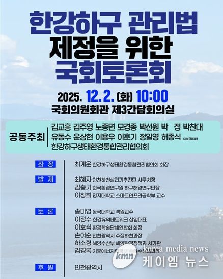 (케이엠뉴스) 인천광역시는 국회의원실과 한강하구 생태환경 통합관리협의회가 공동 주최한 ‘한강하구관리법 제정을 위한 국회 토론회’가 12월 2일 오전 10시, 국회의원회관 제3간담회의실에서 개최됐다고 밝혔다.