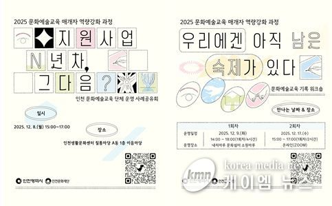 (케이엠뉴스) 인천광역시와 (재)인천문화재단은 인천 지역에서 활동하는 문화예술교육 매개자의 전문성 향상과 지속가능한 활동 기반을 위해 '2025 문화예술교육 매개자 역량강화 과정'을 오는 12월 8일부터 17일까지 운영한다.