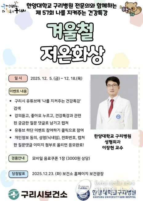 (케이엠뉴스) 구리시는 겨울철을 맞아 시민들의 저온화상 예방을 위해 각별한 주의를 당부하고자, 오는 5일 한양대구리병원 성형외과 이장현 교수와 함께하는 ‘나를 지켜주는 건강특강’을 구리시 공식 유튜브 채널(구리비전)을 통해 송출한다고 밝혔다.