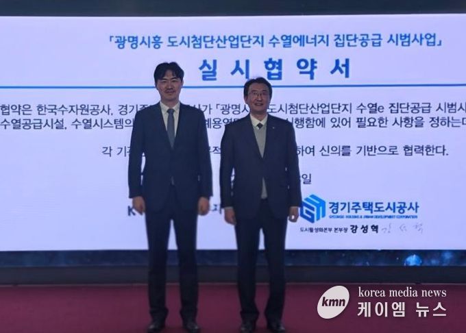 (케이엠뉴스) 경기주택도시공사(GH)는 3일 GH 수원 본사 9층 역량개발센터에서 한국수자원공사(K-water)와 함께 ‘광명시흥 도시첨단산업단지 수열에너지 집단공급 시범사업’ 추진을 위한 실시협약을 체결했다고 밝혔다. 이 자리에는 양 기관 관계자 약 30명이 참석했다.