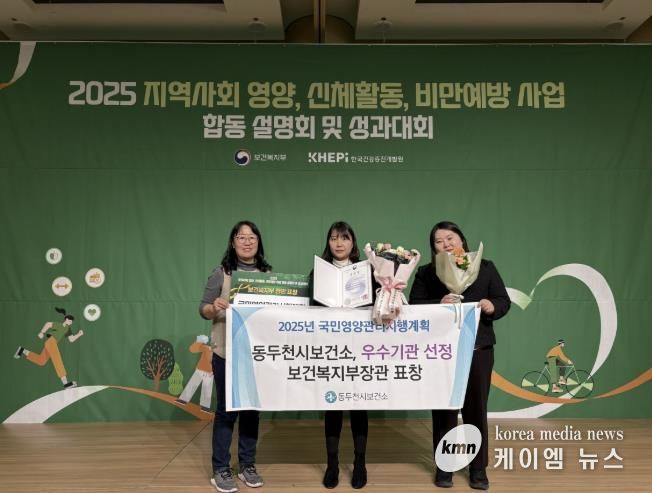 (케이엠뉴스) 동두천시보건소는 지난 2일 열린 지역사회 영양·신체활동·비만예방 사업 합동 성과대회에서 ‘2025년 국민영양관리시행계획 평가’ 우수기관으로 선정돼 보건복지부 장관 표창과 포상금 100만 원을 받았다.