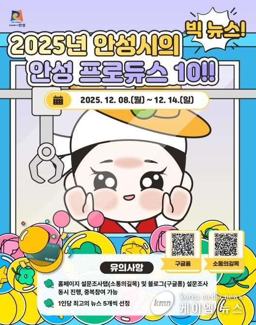 (케이엠뉴스) 안성시는 8일부터 14일까지 7일간 ‘2025년을 빛낸 안성시 10대 뉴스’ 선정을 위한 온·오프라인 시민 투표를 진행한다고 밝혔다.
