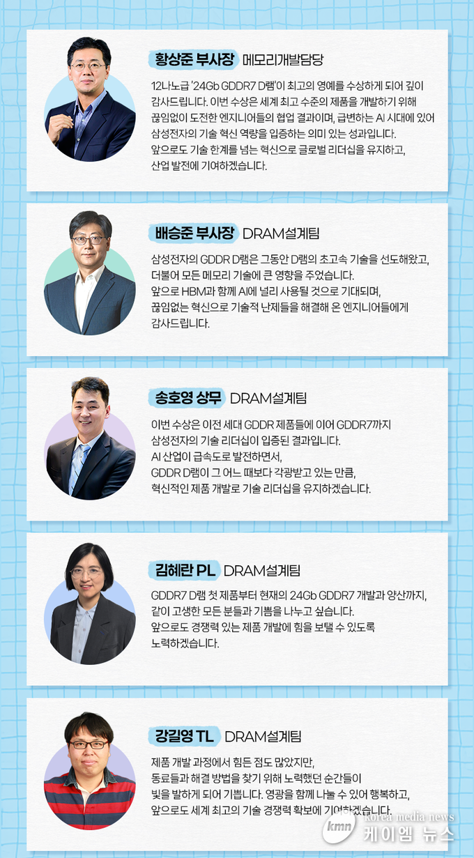 수상의 영예를 차지한 12나노급 ‘24Gb GDDR7 D램’은 차별화된 고용량, 고성능으로 데이터센터·AI 워크스테이션·PC·게임 콘솔 등에서 많은 데이터를 빠르게 처리하는 초고속 메모리다.